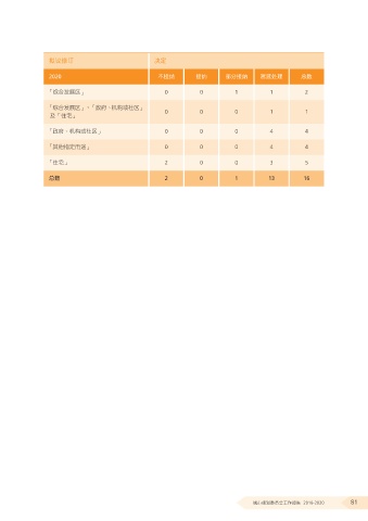 擬議修訂 決定 2020 不接納 接納 部分接納 暫延處理 總數 「綜合發展區」 0 0 1 1 2 「綜合發展區」、「政府、機構或社區」 0 0 0 1 1 及「住宅」 「政府、機構或社區」 0 0 0 4 4 「其他指定用途」 0 0 0 4 4 「住宅」 2 0 0 3 5 總數 2 0 1 13 16 城市規劃委員會工作報告 2018-2020 81