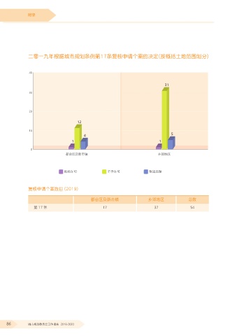 附錄 二零一九年根據城市規劃條例第17條覆核申請個案的決定(按概括土地範圍劃分) 40 31 30 20 12 10 4 5 1 1 0 都會區及新市鎮 鄉郊地區 批給許可 不予許可 暫延處理 覆核申請個案數目 (2019) 都會區及新市鎮 鄉郊地區 總數 第 17 條 17 37 54 86 城市規劃委員會工作報告 2018-2020