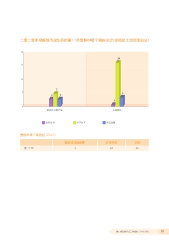 二零二零年根據城市規劃條例第17條覆核申請個案的決定(按概括土地範圍劃分) 30 24 23 15 7 8 5 4 4 1 0 都會區及新市鎮 鄉郊地區 批給許可 不予許可 暫延處理 覆核申請個案數目 (2020) 都會區及新市鎮 鄉郊地區 總數 第 17 條 15 30 45 城市規劃委員會工作報告 2018-2020 87